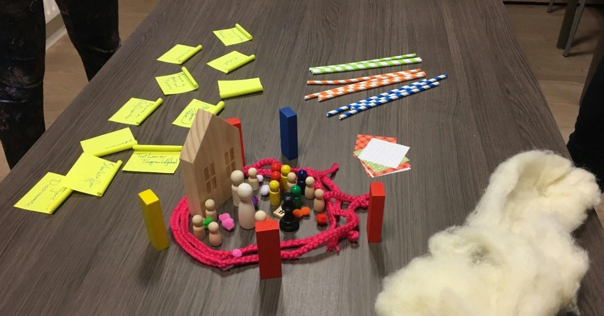 Ik vraag ze met materialen de huidige situatie neer te zetten, een soort 3D plattegrond van de gezamenlijke opgave te maken. En daarbij ook zichtbaar te maken wie erbij betrokken zijn en hoe die zich tot de opgave en elkaar verhouden.